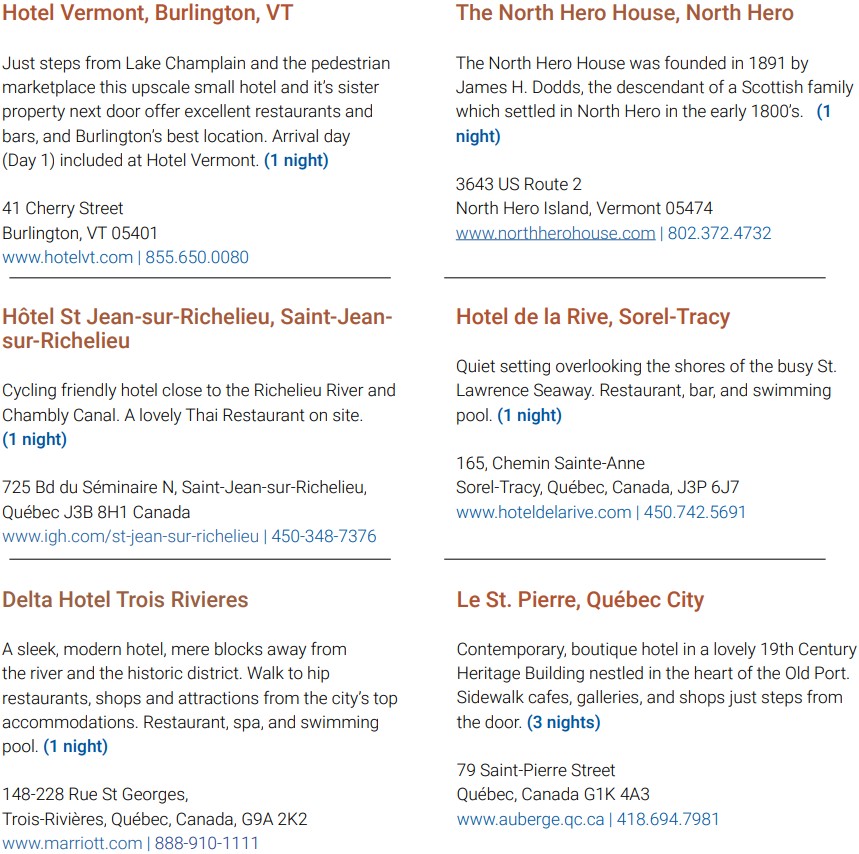 | TOUR START | 9:00am Day 2 – Meet your tour leaders at Hotel Vermont/Courtyard Burlington Harbor. |